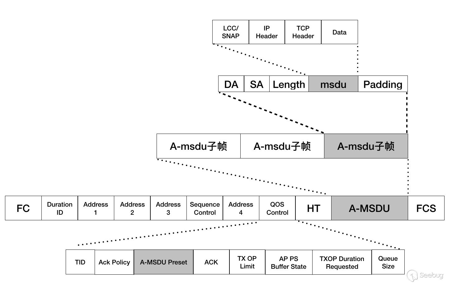 - 多個MSDU子幀組成一個802.11幀的A-MSDU域。