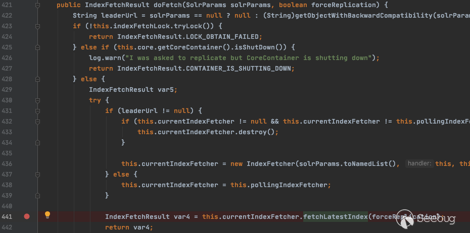 Solr 的 ReplicationHandler 在傳入 command 為 fetchindex 時,會請求傳入的 masterUrl,漏洞點如下: