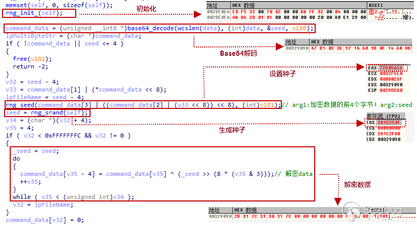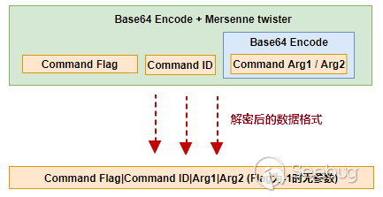 后門所有通信流量的加解密均采用Base64和梅森旋轉算法(Mersenne twister)。解密控制指令數據時,其先使用Base64對字串進行解碼,之后再將加密數據的前4個字節作為種子,通過Mersenne twister進行解密,解密后的數據使用‘|’作為分隔符。如果數據中包含參數,則參數部分還需再進行一次Base64解碼。解密后的數據格式如圖3-38所示。