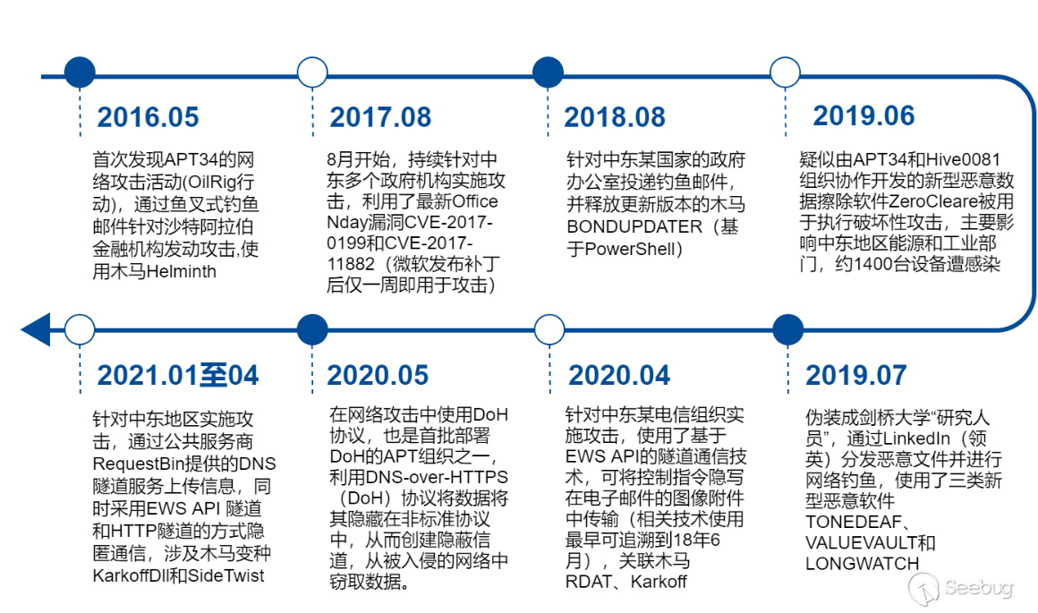 APT34(OilRig)于2016年首次被Palo Alto Networks發現,其最早的攻擊活動可追溯到2014年。自該黑客組織活躍開始,其每年都會針對中東地區的金融、政府、能源、化工、電信等重要行業實施網絡攻擊。2016年5月,首次被發現通過魚叉式釣魚郵件針對沙特阿拉伯金融機構發動攻擊,使用了基于HTTP和DNS通信的木馬Helminth。2017年8月開始利用最新的Office Nday漏洞CVE-2017-0199和CVE-2017-11882針對中東地區的政府機構實施釣魚攻擊,涉及木馬POWRUNER 和BONDUPDATE。2018年則持續針對中東各國的政府機構進行攻擊,后門為基于Powershell的變種木馬BONDUPDATE。2019年6月開始,疑似由APT34與Hive0081組織協作開發的新型惡意數據擦除軟件ZeroCleare被用于執行破壞性攻擊,影響到中東地區多個能源和工業部門的組織,約1400臺設備遭感染。2019年7月,偽裝成劍橋大學“研究人員”,通過LinkedIn(領英)分發惡意文件并進行網絡釣魚,使用了三類新型惡意軟件TONEDEAF、VALUEVAULT和LONGWATCH。2020年4月,在針對中東電信組織的攻擊中新穎的使用了基于EWS API的隧道通信技術(郵箱作為C&C),可將控制指令隱寫在電子郵件的圖像附件中傳輸,關聯木馬RDAT、Karkoff。2020年5月,在網絡攻擊中使用DNS-over-HTTPS(DoH)協議,也是首批部署DoH的APT組織之一。2021年1月至4月,繼續針對中東地區實施攻擊,通過公共服務商RequestBin提供的DNS隧道服務上傳信息,同時采用EWS API隧道和HTTP隧道的方式隱匿通信,本文也將重點分析最新攻擊活動中涉及的木馬變種KarkoffDll和SideTwist。