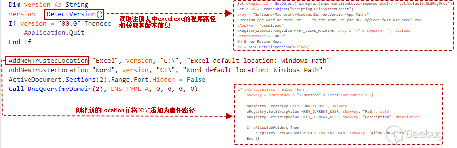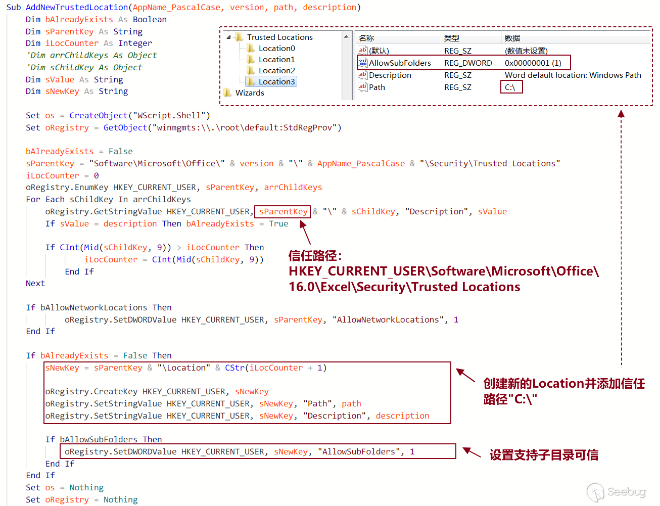 然后,分別針對Excel和Word程序添加Office安全可信路徑的注冊表項(可信路徑為”C:\”),并設置為支持子目錄可信。最終,攻擊者通過增加Office可信目錄可以達到自動執行C盤下Office惡意宏的目的,為后續的入侵活動提供支持。