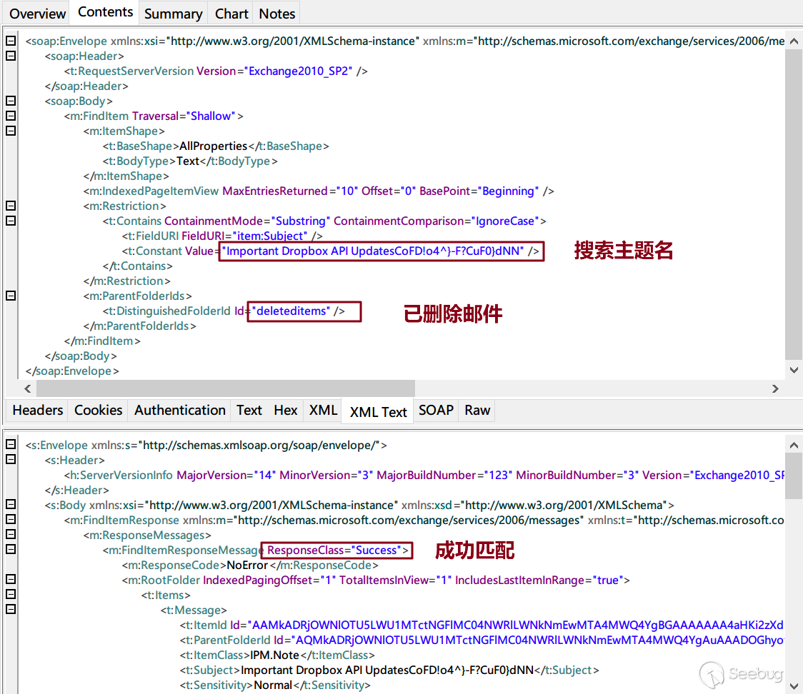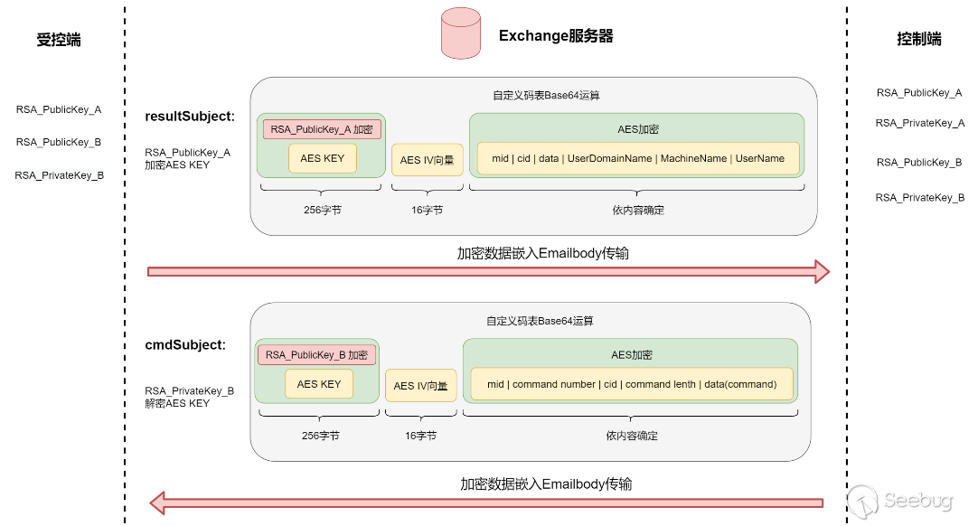 EWS API基于SOAP協議和HTTPS加密通信,其本身已具有較強的安全性。攻擊者進一步還將傳輸數據組合加密后嵌入在Emailbody中對抗流量檢測,并通過前后字符串定位加密數據內容:
