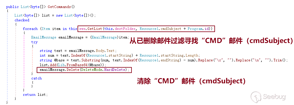 如果從郵件列表中過濾到cmdSubject任務(Important Dropbox API Updates + Program.id),則進一步讀取郵件內容并通過自定義Base64算法解碼提取加密指令。此外,黑客在痕跡清理方面也表現出較強的專業性,在提取指令后會立即清除該CMD郵件以隱藏痕跡。