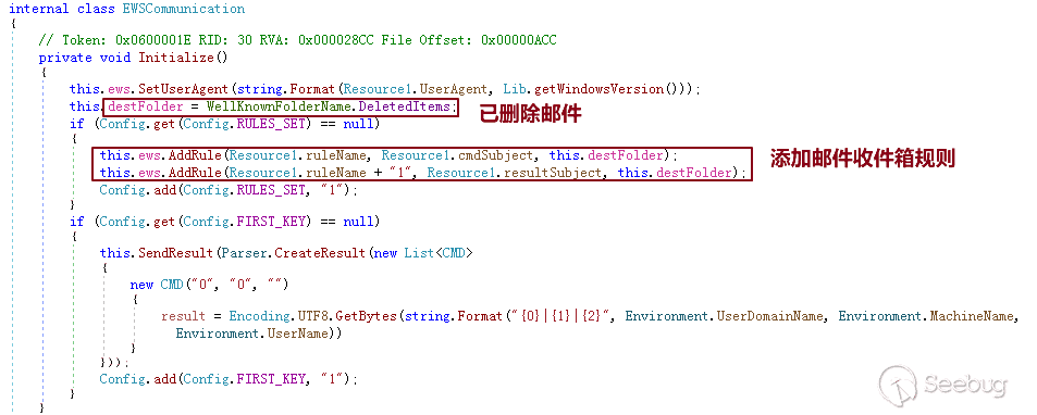 進一步在Initialize()函數中將設置EWS請求的UserAgent、操作文件夾位置(默認為已刪除郵件)。