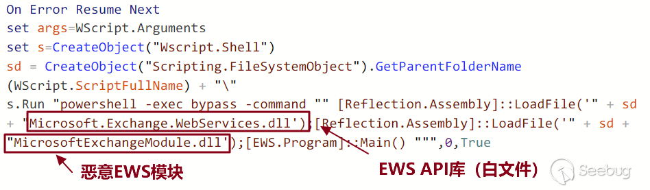 攻擊者將惡意EWS模塊封裝在DLL(MicrosoftExchangeModule.dll)中,并結合Windows任務計劃和exchange.vbs腳本定時加載。
