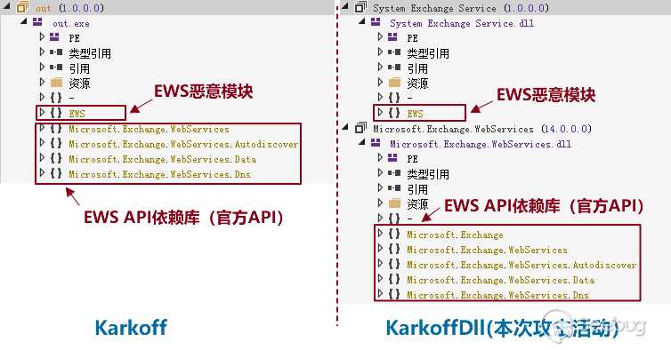 在以往的攻擊中,APT使用的Karkoff后門是以獨立的EXE可執行文件存在,文件名類似out.exe之類的文件,通過計劃任務啟動執行;而本次攻擊中黑客將該后門分離成兩部分,分別為白文件Mircroft.Exchange.WebServices.dll和后門程序System Exchange Service.dll(提高了免殺能力),我們將新變種命名為KarkoffDll。該變種通過VBS腳本啟動,而VBS以計劃任務啟動。