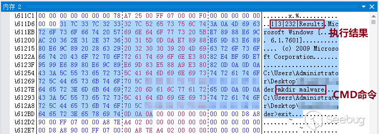 當受控機器接收到“CMD”郵件任務(cmdSubject)時,程序解密并執行指令,然后創建”結果“郵件(resultSubject)上報指令執行結果。如果指令未匹配,則返回”Done:D”。執行CMD命令“mkdir malware”后的返回數據如下: