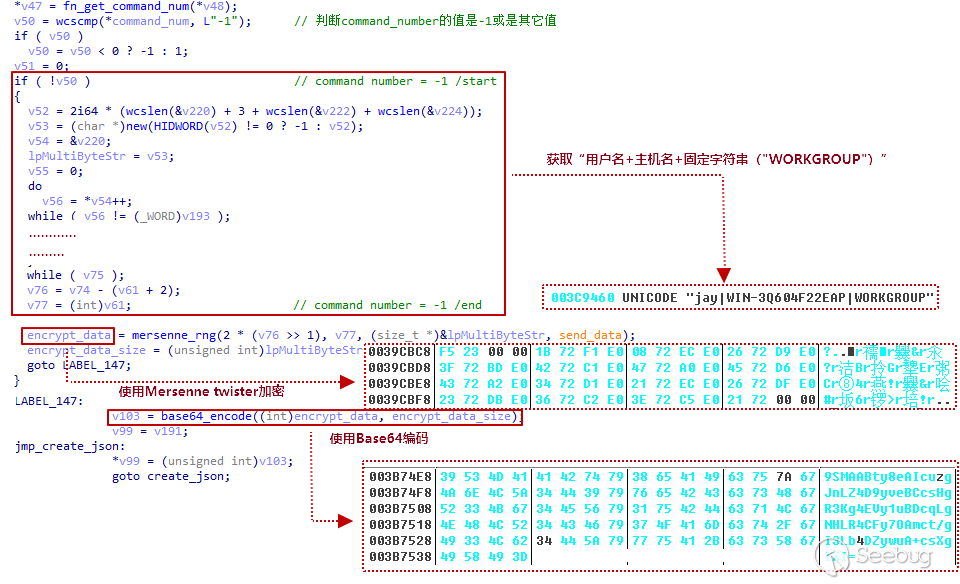 成功解密后,后門首先會提取出控制指令編號,判斷該值是否為-1。如果是,則獲取受感染主機的用戶名以及主機名等信息,并將信息拼接成 “用戶名|主機名|WORKGROUP”(‘|’作為分隔符)格式。之后再使用Mersenne twister和Base64對數據進行加密。