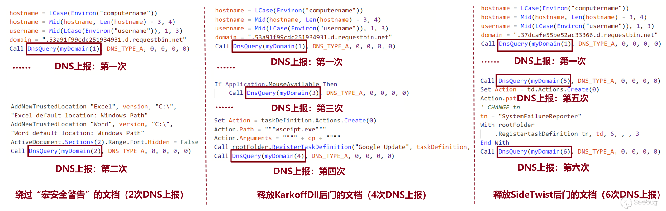 在此次攻擊活動中,誘餌文檔的共性技戰術特點是均通過RequestBin提供的DNS隧道服務進行宏感染情況的上報。我們針對3種不同類型的誘餌文檔進行了比對分析,發現文檔基于功能的不同上報次數也有所差異。初期偵查階段(繞過宏安全警告)的誘餌文檔共2次上報感染階段,而后門植入階段涉及的兩類誘餌文檔分別進行了4次和6次上報,對比情況參考下圖所示。