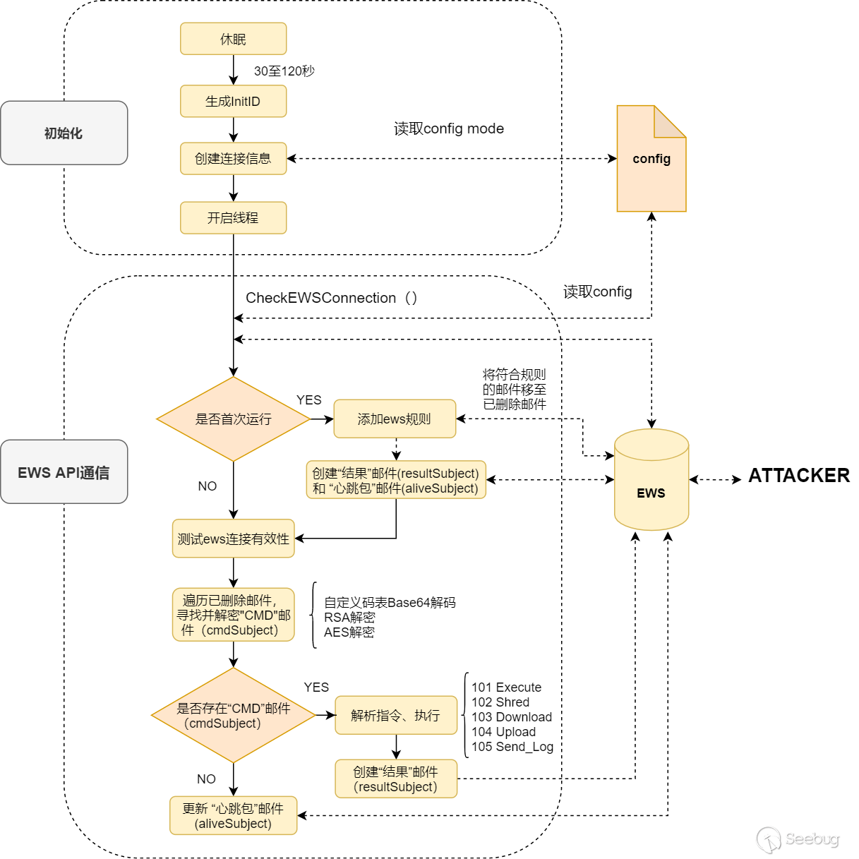 MicrosoftExchangeModule.dll的執行流程如圖3-14所示,我們將分別從初始化、EWS API通信、控制指令三個部分進行介紹。