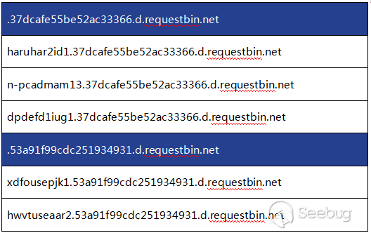 這一部分設施是基于公開的DNSBin服務部署的子域服務,主要用于通知黑客目標已經中招以便進行下一步的攻擊。攻擊者利用公共服務商Requsetbin提供的DNS隧道服務,接收從受害者設備上傳的相關信息。表2-1為該組織在此次攻擊活動中所使用的部分DNS信息。