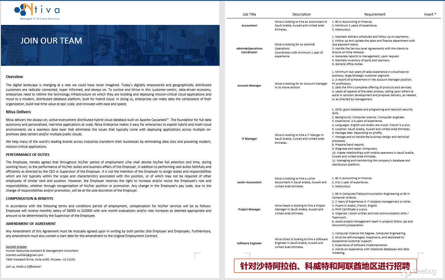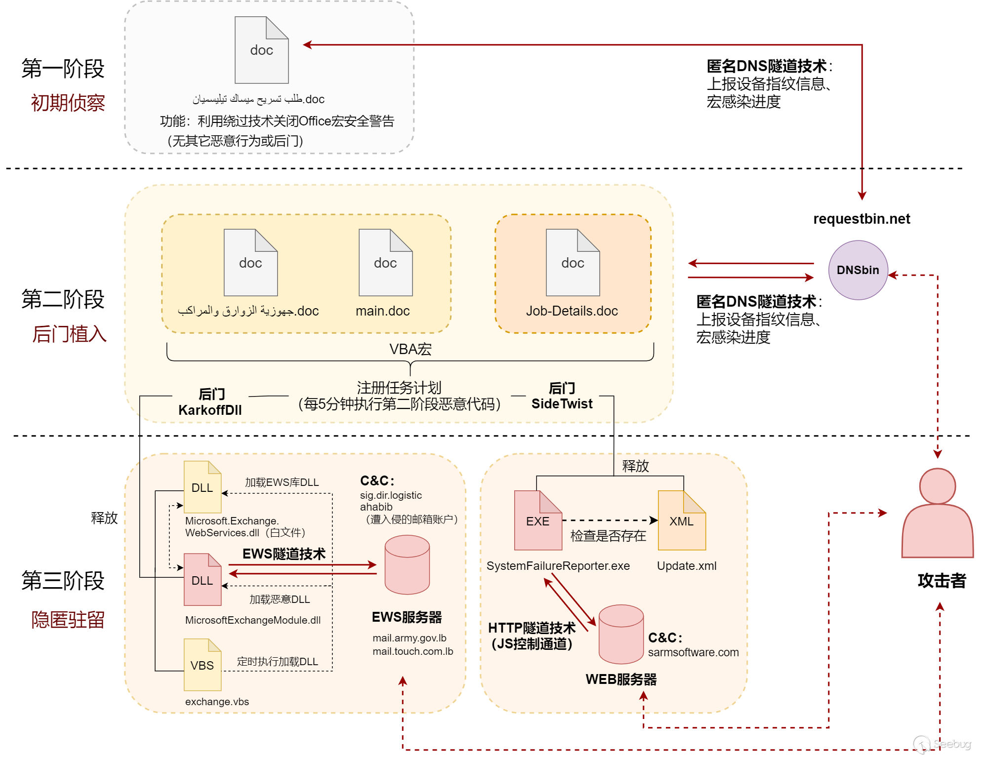 在此次攻擊活動中,APT34主要采用Word誘餌文檔作為攻擊入口,結合竊取的Exchange賬號完成組合入侵。基于文檔內容、語言、C&C(黑客竊取的郵件賬戶)所屬區域,可以判斷是針對中東地區的定向攻擊(主要目標為黎巴嫩,還可能包括沙特阿拉伯、科威特和阿聯酋等)。攻擊文檔偽裝成“黎巴嫩海軍戰艦就緒清單”、“Ntiva公司的招聘信息”(美國IT服務商)、“解雇令”等內容,并在文檔正文中添加誘導性描述以誘使目標啟用惡意宏代碼,從而植入后門程序。值得注意的是,一些攻擊樣本內置了黎巴嫩政府、移動運營商的Exchange郵箱賬戶登陸憑證。相關賬戶在遭到攻擊者的入侵后,被用于以EWS API協議的方式傳輸惡意流量。可以推測攻擊者在先期準備階段已成功入侵了有關組織或與其具有信任關系的郵件賬戶,并借高可信Exchange服務器為信任節點中轉通信,隱藏惡意行為。我們將此次攻擊的手法總結如圖2-2所示。