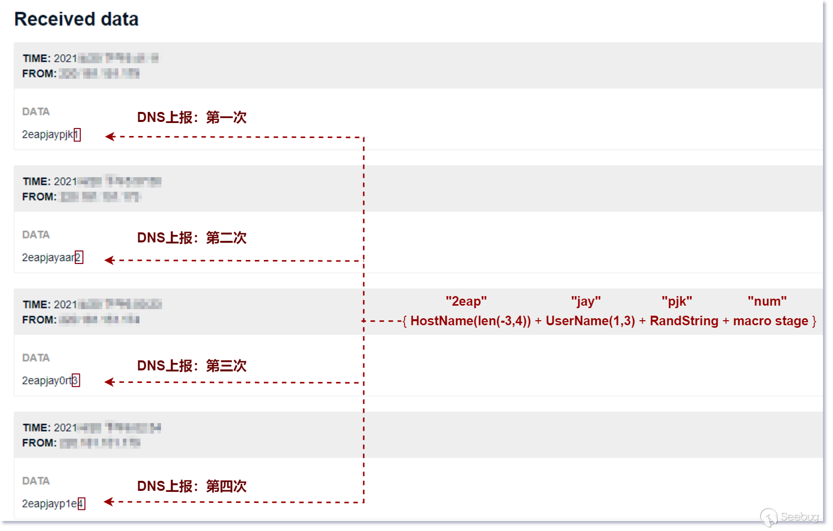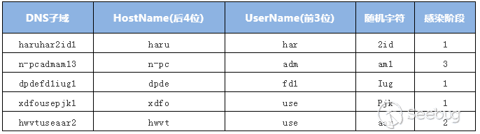 從上表可以看出,子域數據中包含了被截斷的主機名、主機用戶名、隨機信息以及攻擊階段信息(技術細節請參見攻擊案例分析部分)。