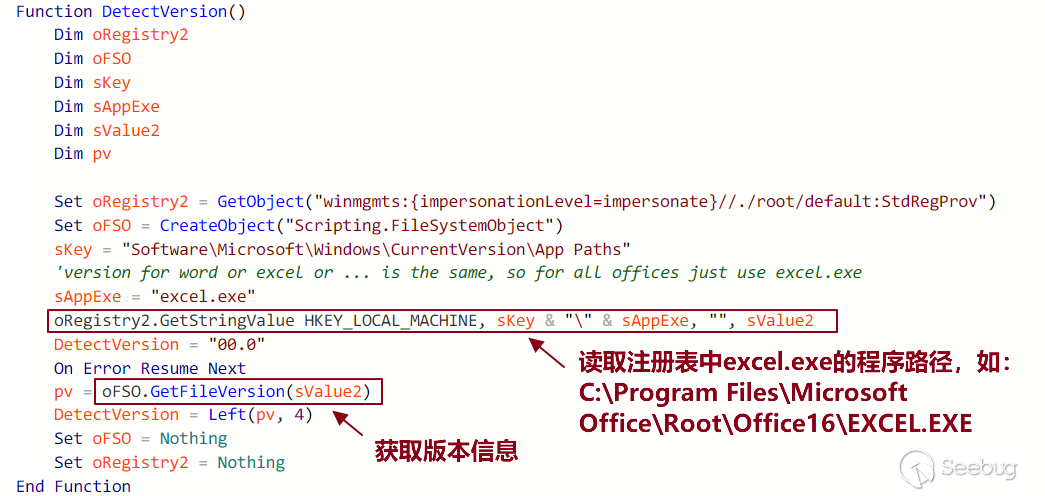 在檢測Office版本時,首先查找注冊表中excel.exe的程序路徑,之后結合GetFileVersion函數獲取Office的所屬版本。