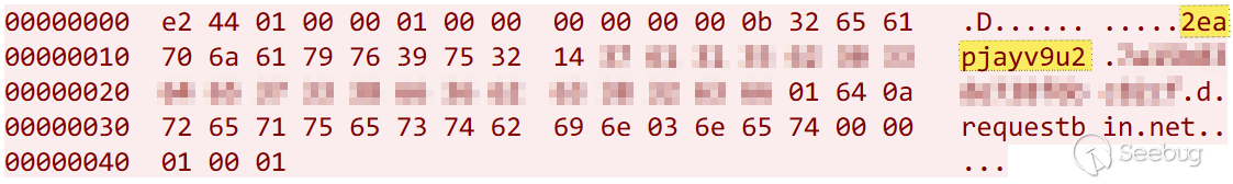 上表中藍色部分為黑客申請的DNSbin服務域名,攻擊代碼在目標設備上成功執行后會基于目標設備信息和簡單隨機化數據構造子域,最后將這兩部分組合起來作為上線請求通知黑客。通過子域信息可以反推出受害設備的一些簡單信息。相關受害者DNS請求數據如下表所示: