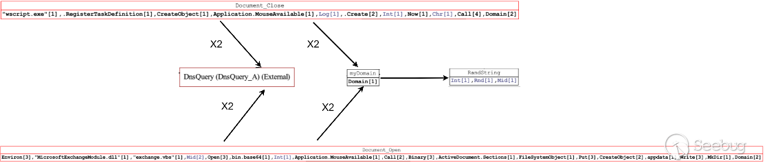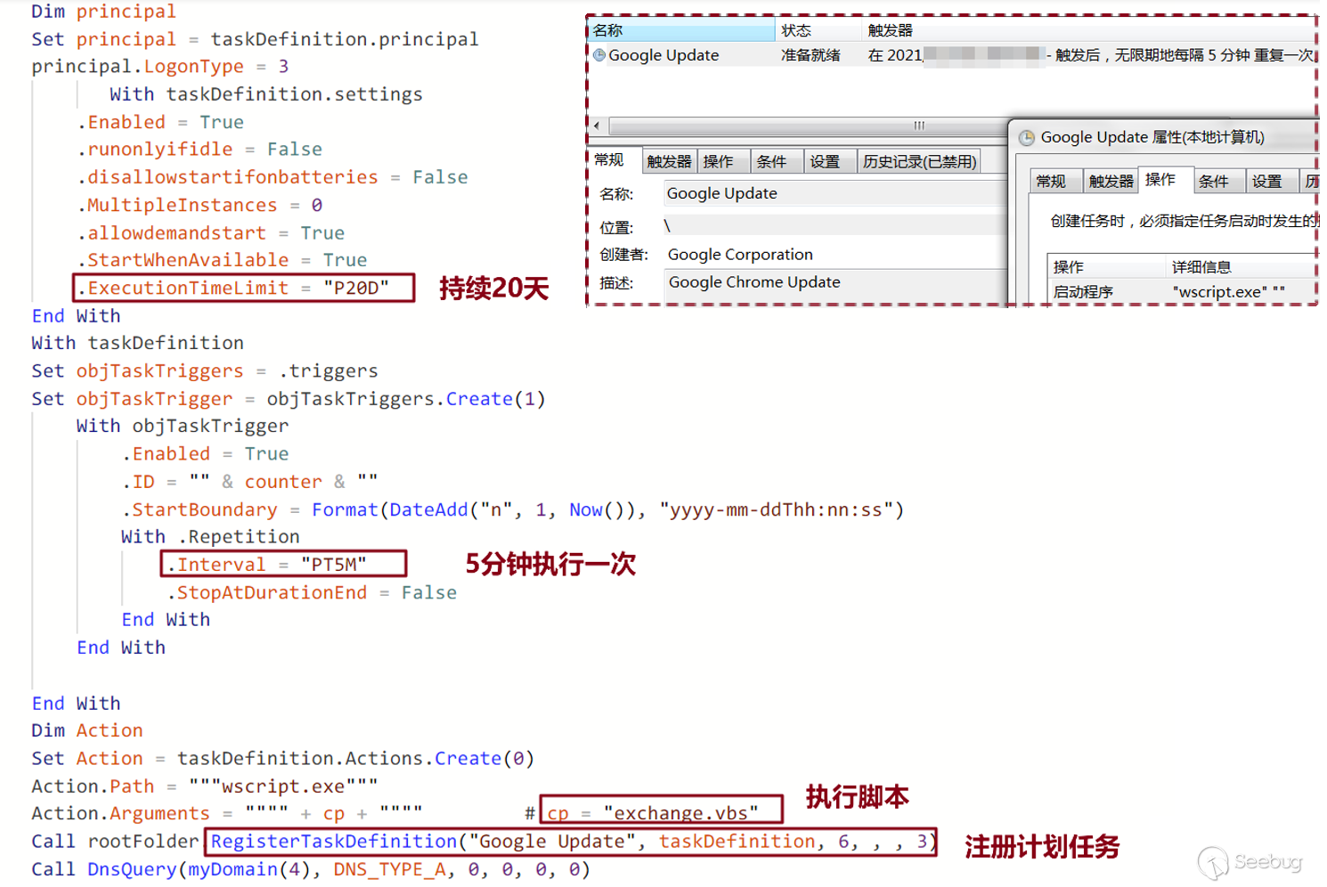 Document_Close(文檔關閉時): 檢查環境是否有鼠標可用(反沙箱) DNS上報感染進度(第三次) 注冊windows任務計劃(偽裝名稱:Google Update),每5分鐘運行腳本(exchange.vbs執行后續惡意代碼), 持續20天 DNS上報感染進度(第四次)
