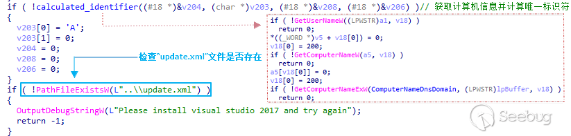 接著獲取主機用戶名、計算機名以及域名等信息,并通過簡單的異或計算出用以標識的唯一值。此外,后門還會檢查“update.xml”文件是否存在于上級目錄中,不存在則輸出調試信息并結束進程。