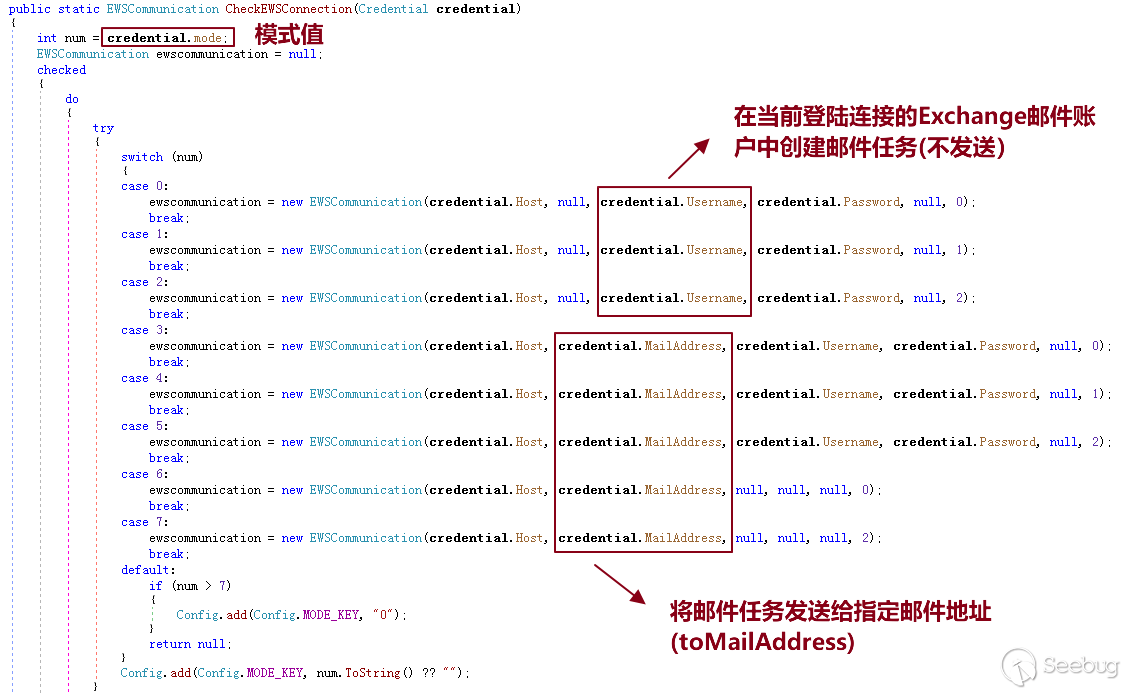 - 2)EWS API通信 初始化后,后門在CheckEWSConnection()函數內根據從配置文件中讀取到的模式值(credential.mode)選擇執行分支。當模式值為0-2時程序會在當前登陸連接的Exchange郵件賬戶中創建郵件任務;當值為3-7時則會將郵件任務發送至黑客指定的郵箱(如:masters.michelle@protonmail.com)。