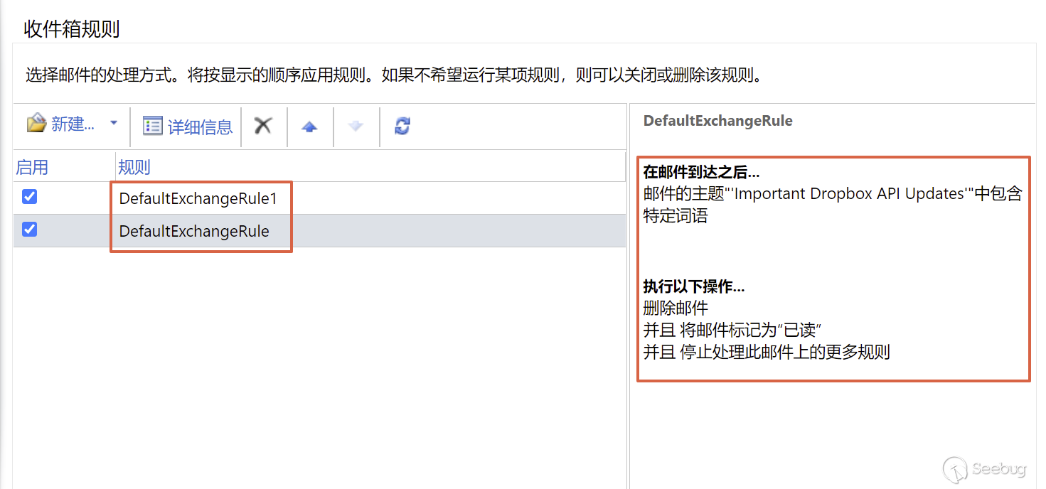 如果是首次執行后門(模式值為0),還將添加以下郵件收件箱規則: (1)DefaultExchangeRule1:若郵件主題中包含“Important Dropbox Updates”字符串,刪除郵件并且將郵件標記為“已讀” (2)DefaultExchangeRule:若郵件主題中包含“Important Dropbox API Updates”字符串,刪除郵件并且將郵件標記為“已讀”