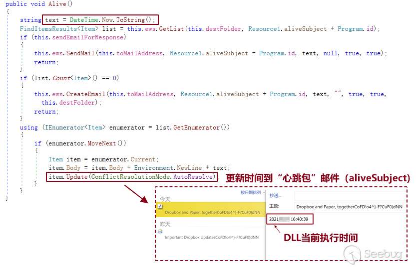 此外,在前期攻擊活動中使用的EWS API郵件通信只支持2種郵件任務:“CMD”郵件任務和“結果”郵件任務,分別用于接收和發送指令,但這兩種任務無法及時提供受控機器的連接情況。APT34在此次攻擊中進行了升級——新增了“心跳包”郵件任務,當“已刪除郵件”中不存在“CMD”郵件時,則更新“心跳包”郵件,攻擊者即可掌握受控機器的上線連接情況。