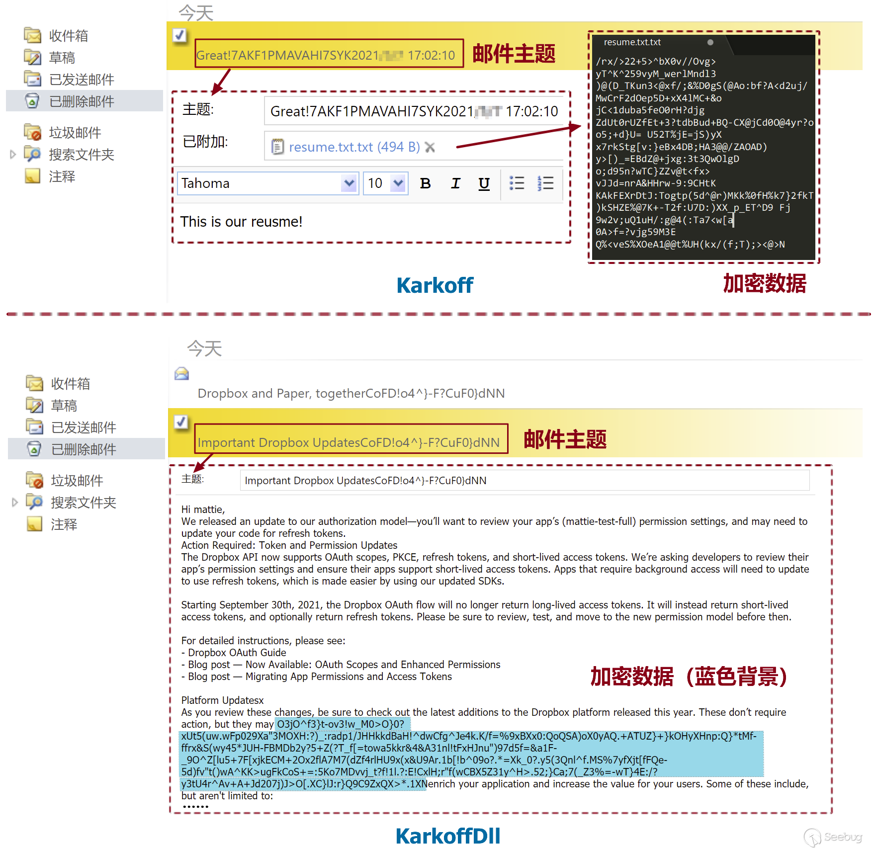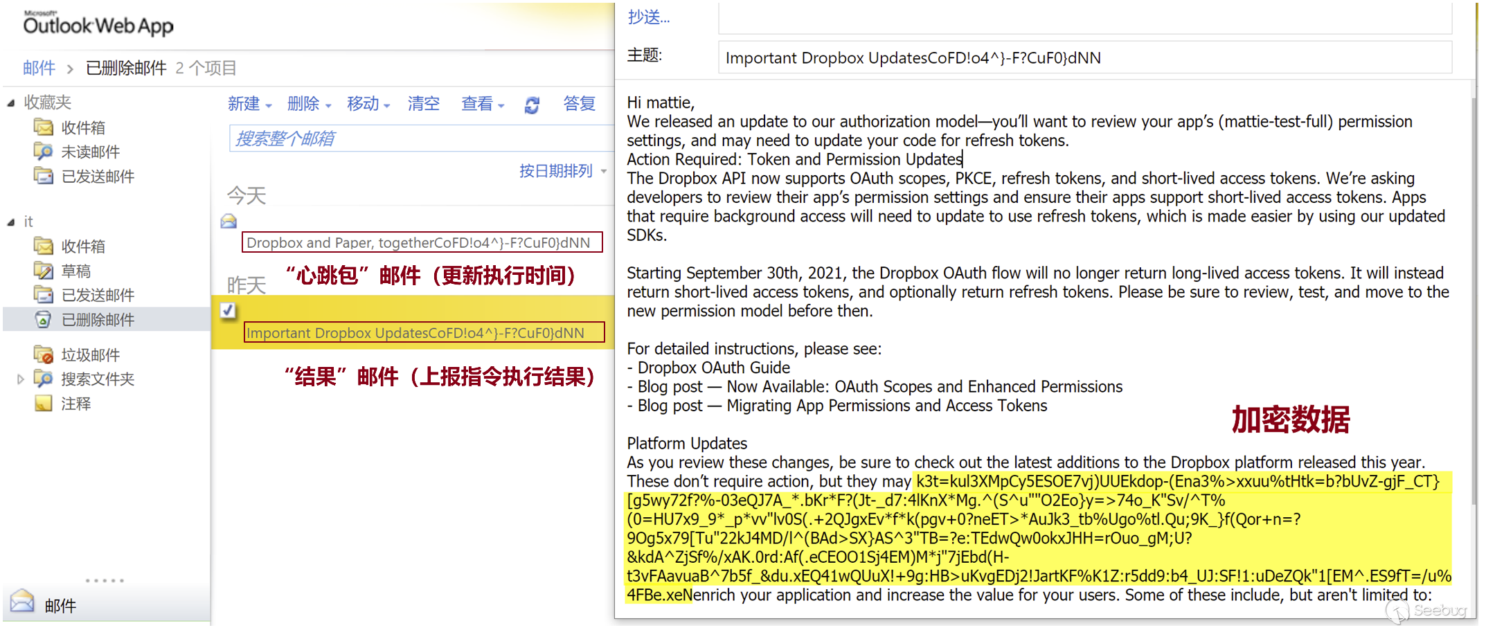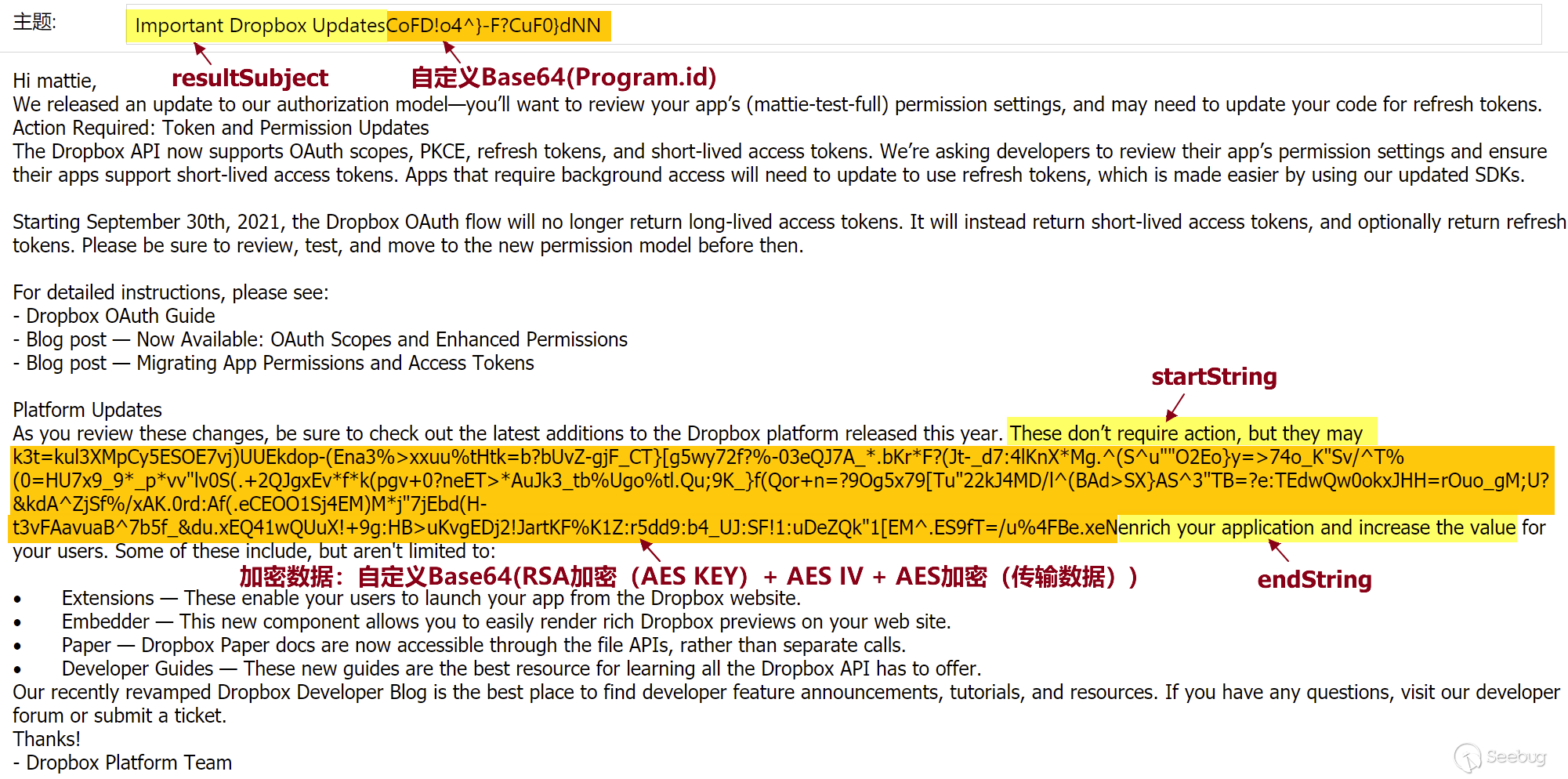 在本次攻擊中,黑客著重針對EWS通信過程中的郵件模板進行了精心設計和偽裝。從先前的攻擊案例來看,用于傳輸數據的郵件任務模板設計簡單,無論是郵件主題前綴(“Great!”),還是郵件內容(“This is our reusme”)都略顯簡易,容易引人生疑。而在此次行動中,攻擊者通過精心仿造Dropbox平臺(網絡存儲服務提供商)的服務更新郵件來混淆視聽,郵箱用戶即使關注到惡意郵件內容(存儲于已刪除郵件),也很可能會誤認為是Dropbox平臺正常的服務郵件而忽略。另外,在前期攻擊活動中通信數據被加密隱寫在圖像附件(RDAT)或TXT文本附件(Karkoff)中,此次攻擊則隱藏在郵件Emailbody正文尾部,一方面可以起到不錯的視覺混淆效果,另一方面也能避開部分針對郵件附件的文件檢測。