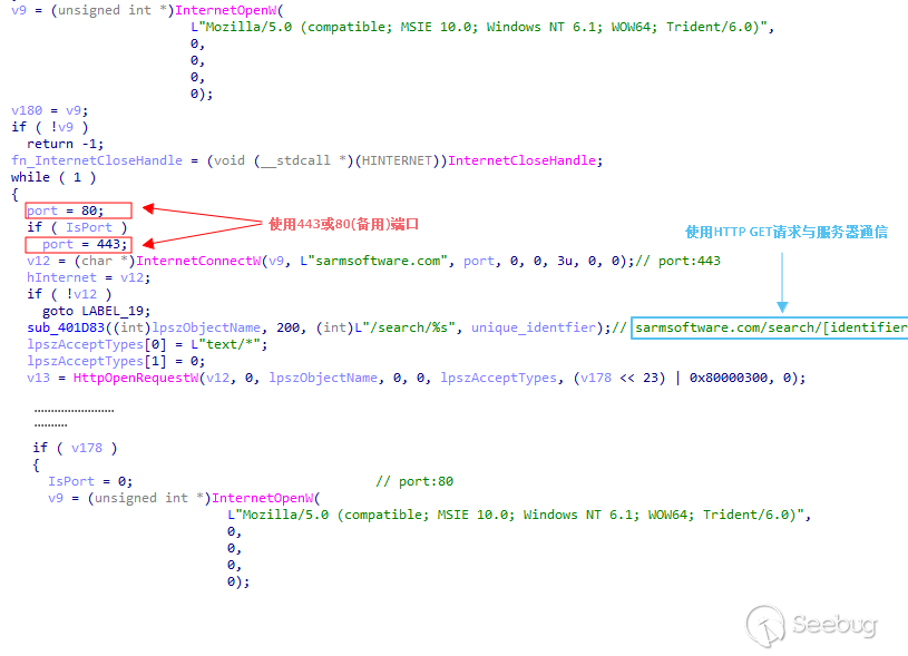 如該文件存在,后門則發送HTTP GET請求到C&C服務器 (sarmsoftware.com/search/[identifier]),使用的端口號為443,并將80作為備用的端口號。