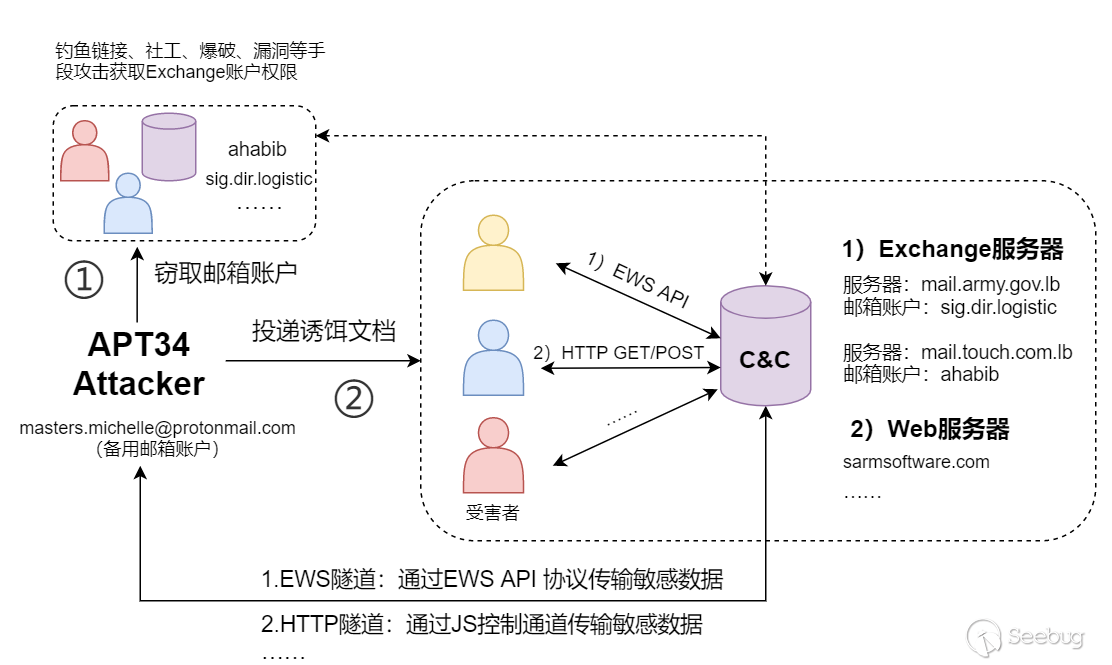 APT34首次被披露于2016年,是一個來自于伊朗的APT組織,其最早活躍時間可追溯到2014年,攻擊目標主要集中在中東及亞洲地區,涉及金融、政府、能源、化工、電信等行業。APT34善于采用通信隱匿技術來規避檢測和追蹤,比如:通過Exchange Web Services (EWS) API實現高可信度、高隱匿性的“EWS隧道技術”。