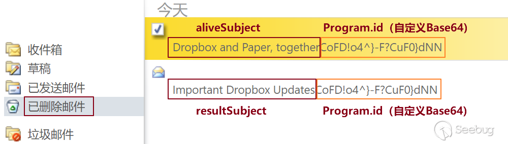 首次執行后門時受控機器會創建默認的“心跳包”郵件和“結果”郵件,“CMD”郵件則會由攻擊者在下發控制指令時創建。 “心跳包”郵件主題名結構:aliveSubject + Program.id(自定義Base64) 示例:" Dropbox and Paper, together CoFD!o4^}-F?CuF0}dNN"