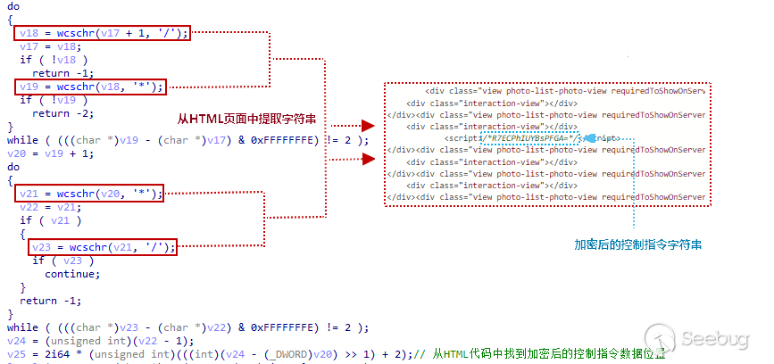 根據目前掌握的信息可知,SideTwist是APT34在本次攻擊活動使用的一款新后門。該后門在與C&C交互時,采用了較隱匿的通信機制。攻擊者將加密后的控制指令數據隱藏在html頁面的<script>標簽中,并以注釋的形式存儲。當后門獲取指令時,則使用HTTP請求從偽造的虛假頁面中提取控制指令數據。這能非常有效地逃避流量監視和檢測。