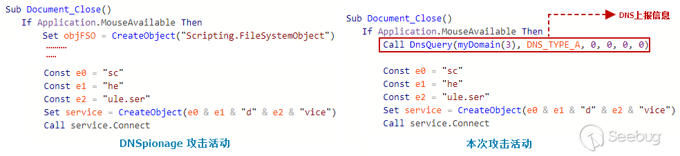 在初期偵察階段,攻擊者通過投遞“無害”的惡意文檔誘導受害者點擊執行宏代碼。宏代碼的主要功能是繞過Office宏安全警告,同時會將宏感染情況通過DNS上報給攻擊者(DNS上報信息是此次攻擊活動中誘餌文檔的共性特點,將在階段二中具體分析)。文檔宏的核心代碼如下: