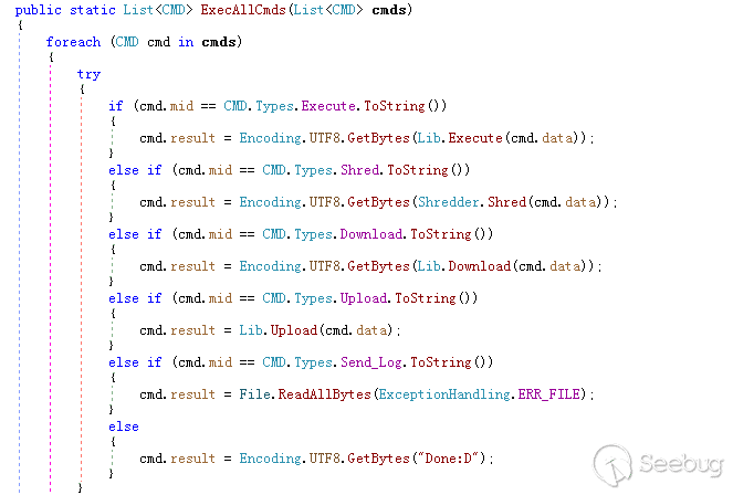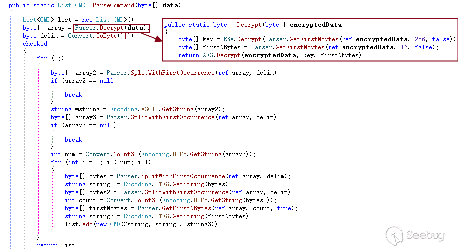 加密指令經過GetCommands()函數解碼后,進入ParseCommand()函數進一步解析密文,依照RSA私鑰解密(得到AES密鑰)、AES密鑰+IV解密(得到明文)的順序提取出指令內容。