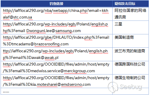 通過相關情報分析,黎巴嫩軍方和移動運營商的郵箱賬戶極有可能為該黑客組織前期通過釣魚或Exchange爆破工具竊取。該組織在2019年曾發生過數據泄露事件,其通過漏洞、釣魚攻擊、Exchange爆破工具攻陷了大量Exchange賬戶。下表梳理了APT34使用的部分釣魚鏈接:
