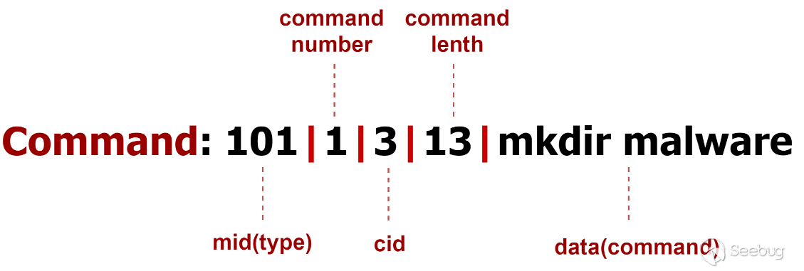 指令解析后對應5種類型,以指令值101(功能:執行CMD命令)為例: “101|1|3|13|mkdir malware”,其控制指令結構示意如下: