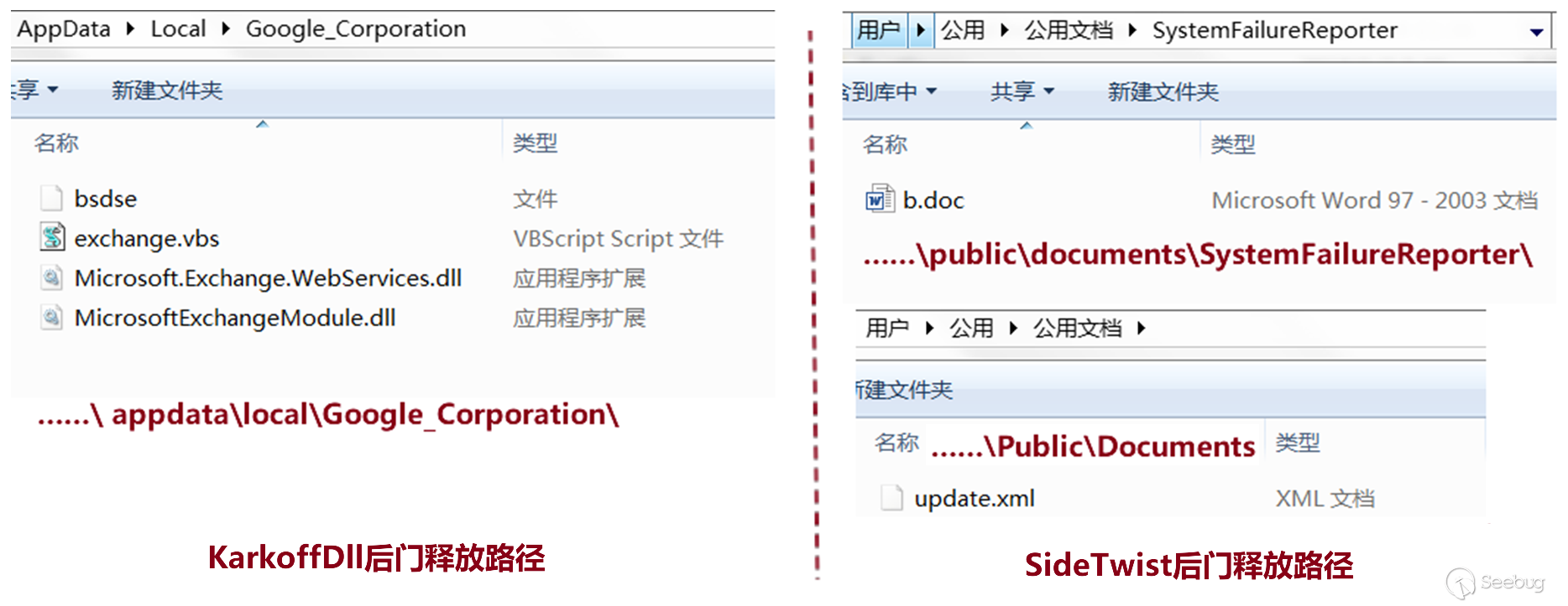 當受害者打開文檔時(Document_Open),宏代碼通過Base64解碼并釋放后續的惡意代碼。此階段包含兩類不同的后門KarkoffDll和SideTwist,其釋放路徑和加載方式也有所不同,相關路徑如下所示: “……\ appdata\local\Google_Corporation\”(KarkoffDll) "……\public\documents\SystemFailureReporter\"(SideTwist)