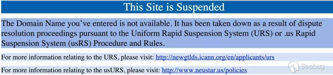 2、通過域名仲裁啟動統一快速中止程序(URS)[6]。該程序主要用于解決由商標權、域名搶注等原因產生的域名爭議問題。投訴人需向域名爭議解決中心等提供URS服務的機構提出申請,相關域名在仲裁期間將被鎖定交易。當投訴人勝訴時,域名在剩余注冊期內將被暫停使用并解析到URS信息頁面(圖6),直到域名被轉讓給投訴人。