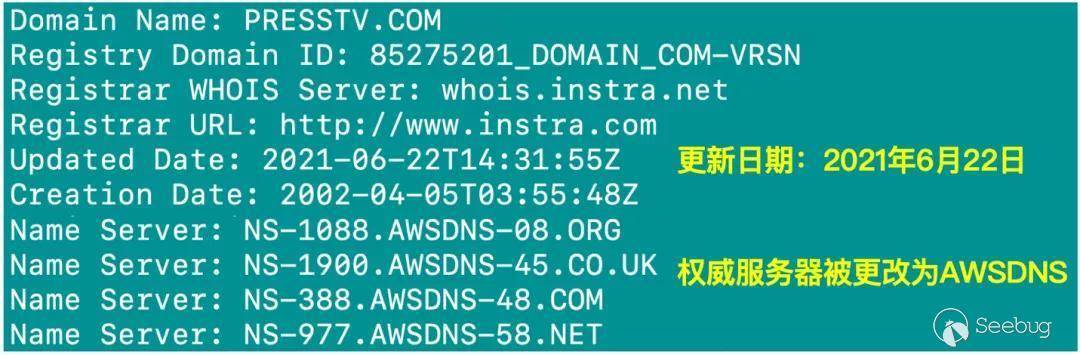 本次域名查封是美國執法部門要求域名注冊局(registry)執行的,與注冊商(registrar)無直接關系。根據安全公司披露的域名清單[3],被查封的部分網站頂級域分布為:.tv(14個)、.com(11個)、.net(6個)、.org(2個)。管理上述頂級域的注冊局為Verisign和PIR,二者均位于美國。注冊局提供的WHOIS數據顯示,在UTC時間6月22日14時左右,所有被查封域名的權威服務器被統一更改為亞馬遜公司DNS服務器地址,如圖3所示。