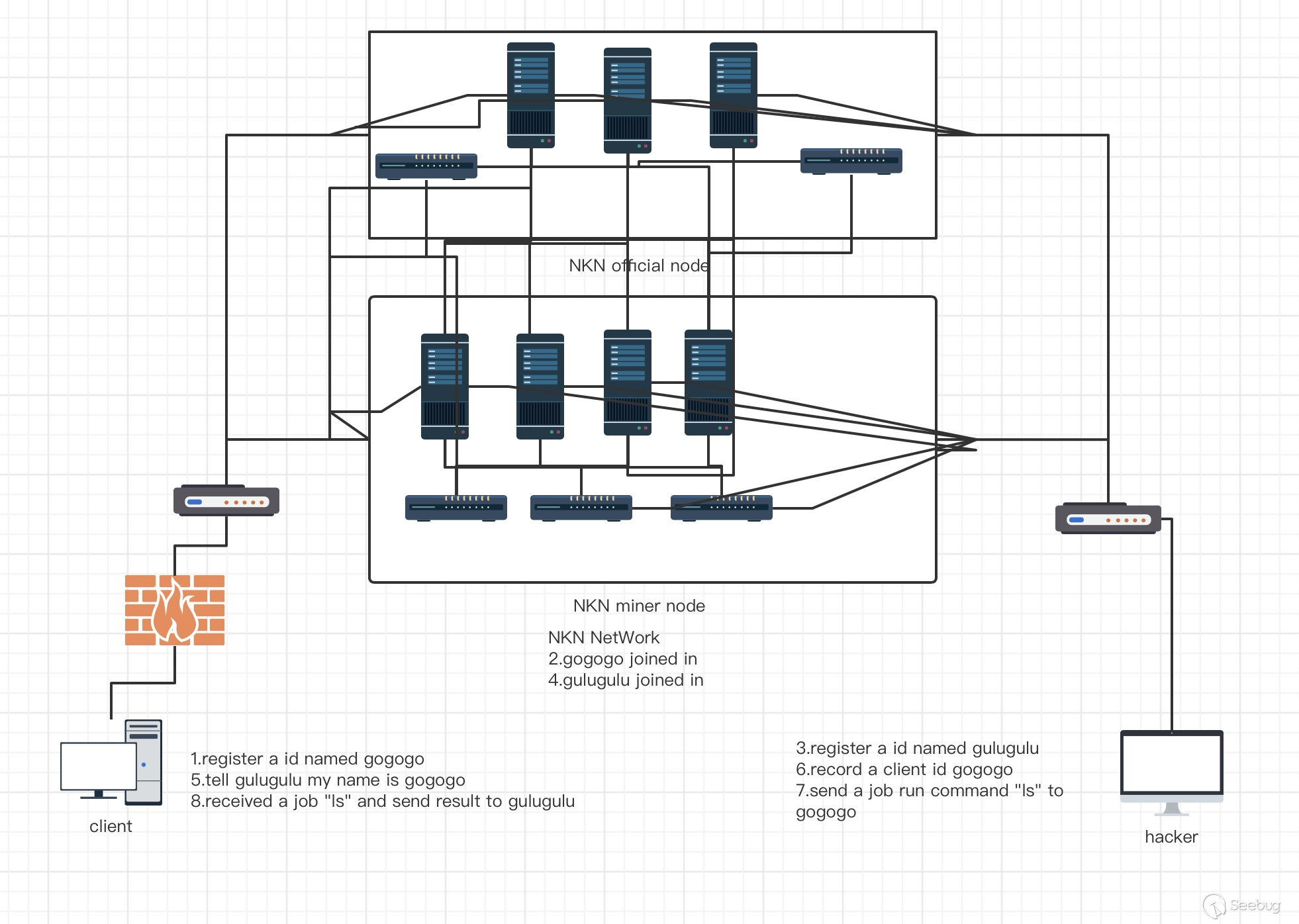 所有客戶端/服務端均直接鏈接NKN的官方節點/由用戶加入NKN網絡的挖礦節點,所有節點均只知道相鄰的鄰居節點。此時客戶端和服務端在網絡中幾乎對等。服務端在無公網IP端口的情況下,僅需能鏈接外網,有外網訪問的權限,即可作為被連接的對象。