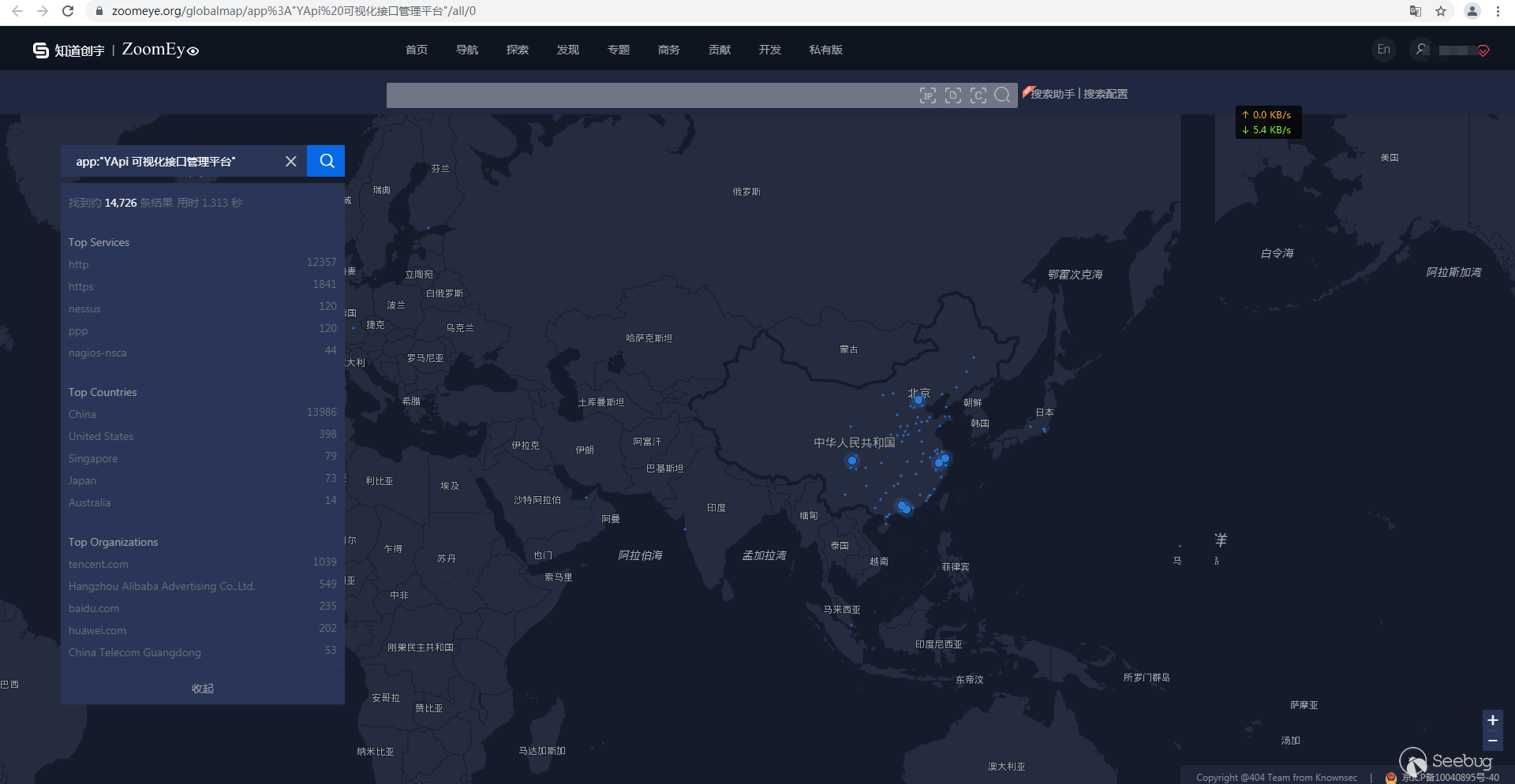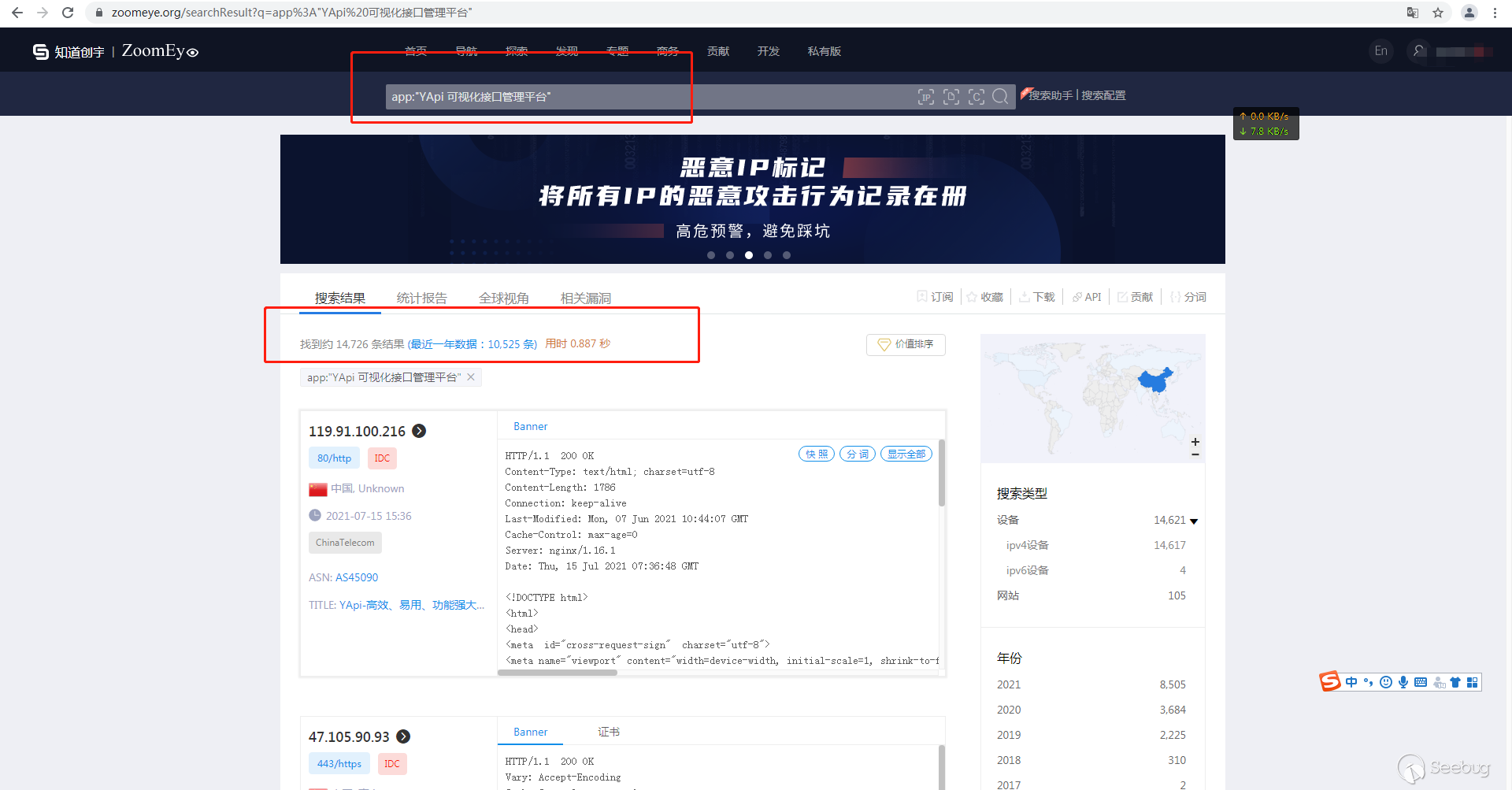 通過ZoomEye網絡空間搜索引擎,搜索ZoomEye dork數據挖掘語法查看漏洞公網資產影響面。