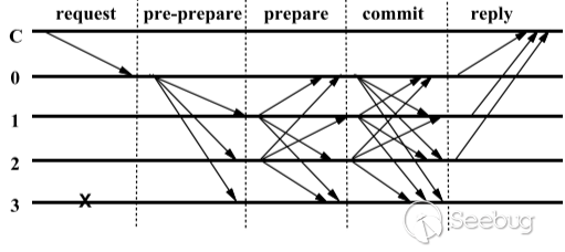 在正常情況下,PBFT 使用如下通信過程協商請求消息的操作順序 。由特定的、負責確定順序的服務器(稱為 Primary 圖中的 0)發起操作 。當 Primary 收到客戶端的請求消息后,確定相應的順序,轉發給其它服務器,通過 2 步通信(Pre-prepare 和 Prepare)保證至少 f+1 臺正確服務器就客戶端請求的執行順序達成一致,然后再經 1 步 Commit 通信通知各服務器。