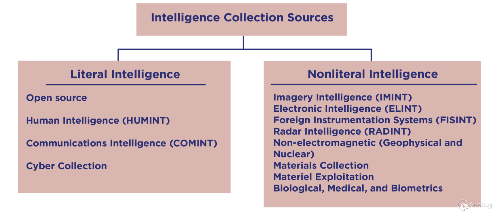 在美國,國家情報收集組織執行所謂的單一來源分析。[1] 簡單講就是什么部門負責什么類型的情報收集和分析,國家安全局(NSA)手機分析通信情報(COMINT)、國家地理空間情報局(NGA)收集處理圖像情報(IMINT),開源中心(OSC)收集處理開源情報(OSINT)。對于這些主體來說,除了他們主要負責的情報外,其他的情報都為附屬情報。