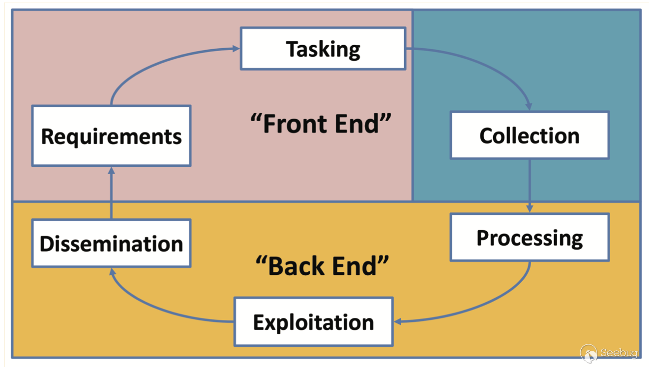 情報的收集通常被描述為一個循環,以下是情報采集的過程視圖,主要把情報的采集分成兩個部分:“前端”和“后端”:
