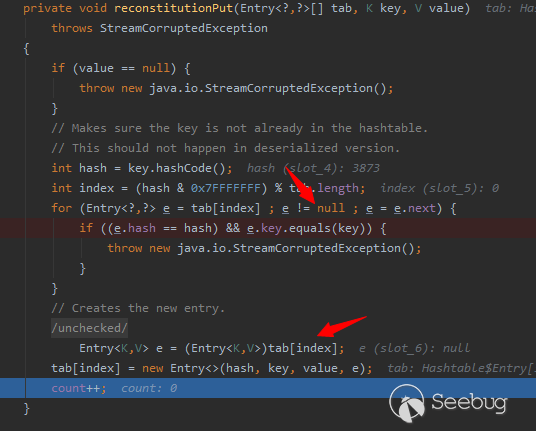 在readObject方法中會根據Hashtable的元素個數判斷調用reconstitutionPut(table, key, value)方法的次數,跟進reconstitutionPut方法。