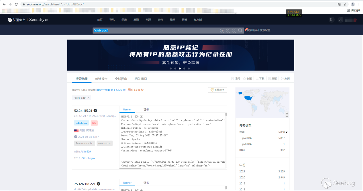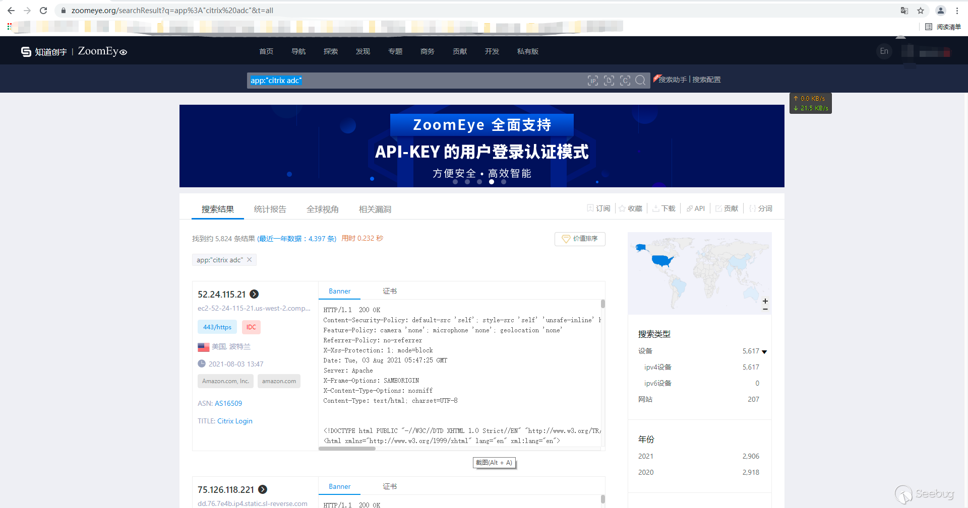 從Banner查詢轉換成ZoomEye dork查詢用app:"citrix adc" 目前這轉換操作需要ZoomEye官方運營人員操作。明顯citrix adc轉換成ZoomEye dork查詢過濾了很多垃圾信息數據、比如蜜罐、提升準確性。