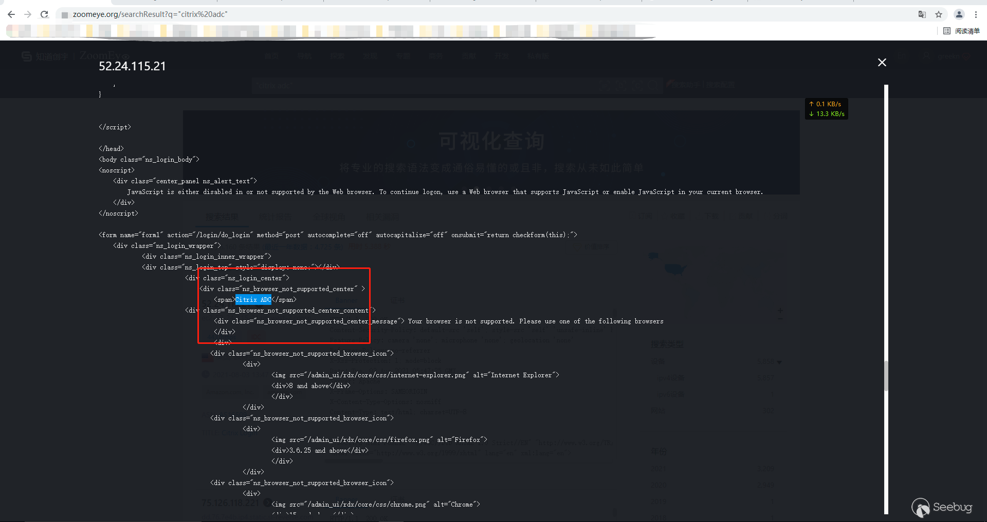 比如用ZoomEye過濾器搜索"citrix adc" Citrix ADC 是應用程序交付控制器,用于分析應用程序特定的流量,以智能地分發和優化 Web 應用程序第 4 層 - 第 7 層 (L4–L7) 的網絡流量并確保其安全。ADC 功能可大致分為交換、安全性和保護、服務器場優化以及全局服務器負載平衡 (GSLB)。其實這個還是屬于banner查詢還沒有轉換成ZoomEye dork查詢還沒有制作規則上傳到ZoomEye平臺。