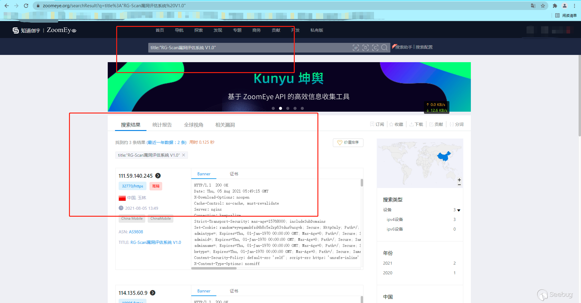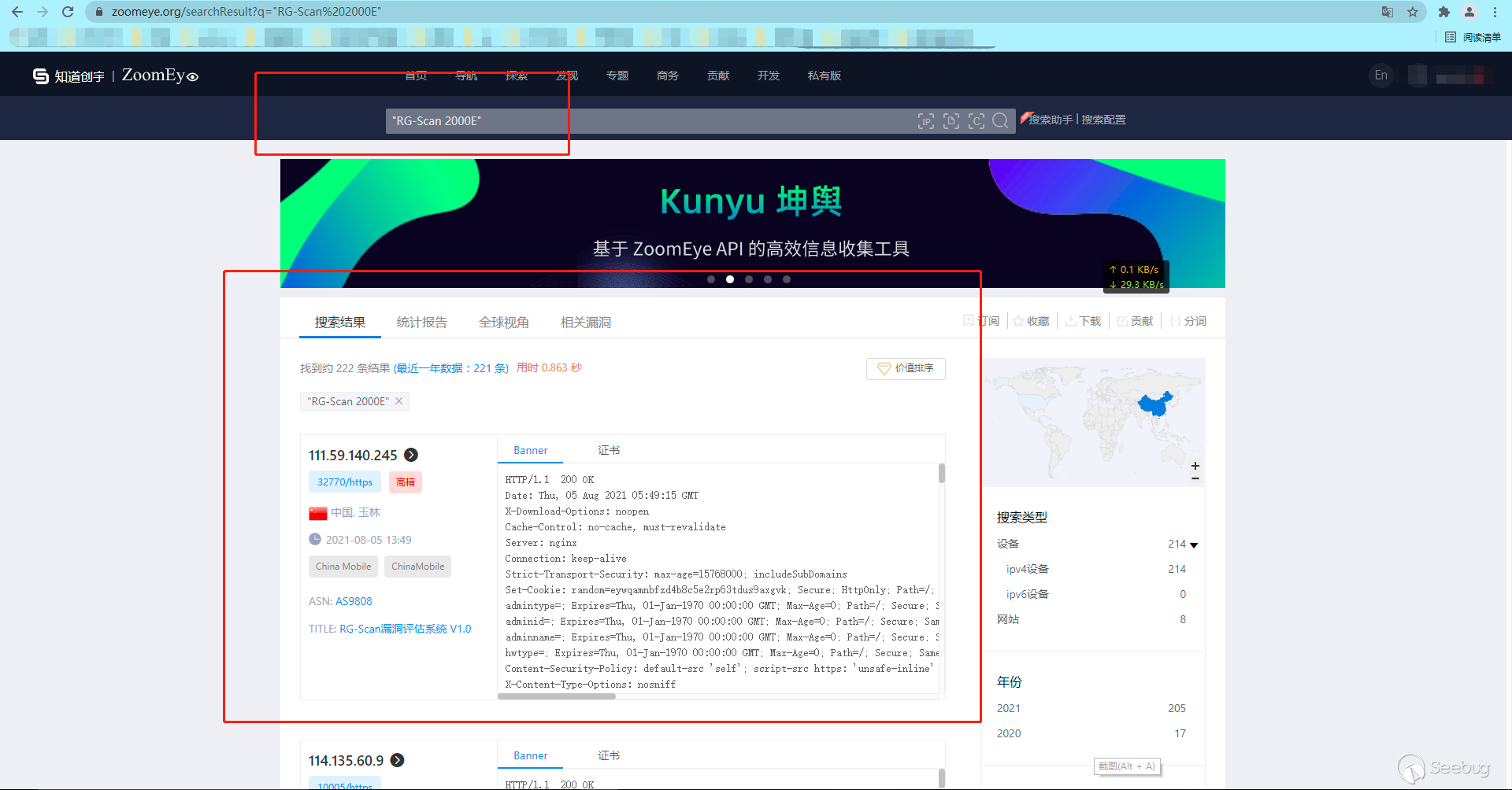 打開ZoomEye根據過濾器語法輸入”RG-Scan 1000E“、”RG-Scan 2000E“、”RG-Scan“