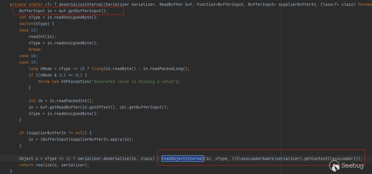 ExternalizableHelper 中調用 readObjectInternal 的地方有兩處,一處是 readObjectInternal , 另一處則是 deserializeInternal 。而 deserializeInternal 會先把 DataInput 轉化為 BufferInut :