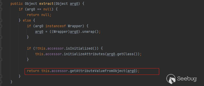 隨后在 filterExtractor.extract 函數中會因為調用 this.attributeAccessor.getAttributeValueFromObject 進而導致任意無參方法的調用。