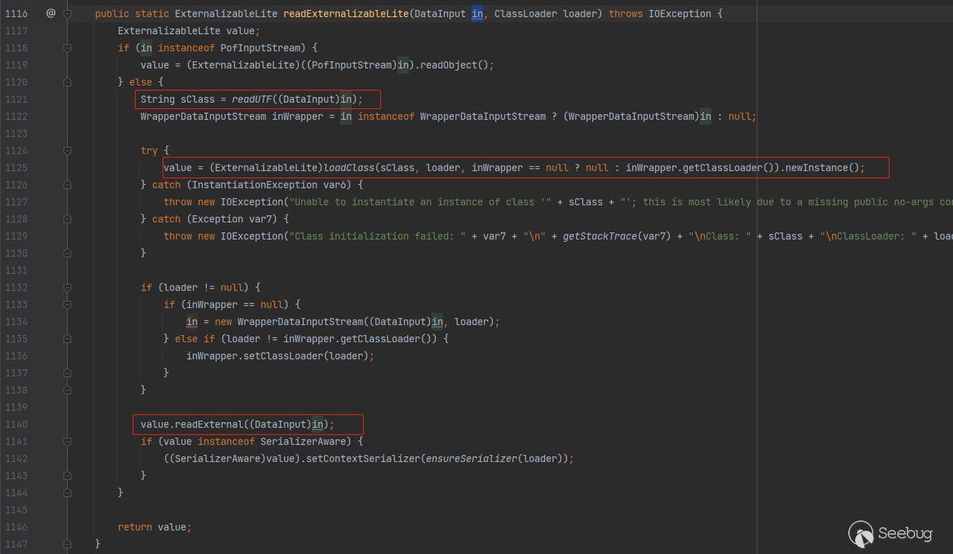 可以看到在 readExternalizableLite 中 1125 行會根據類名加載類,然后并且實例化出這個類的對象,然后調用它的 readExternal() 方法。