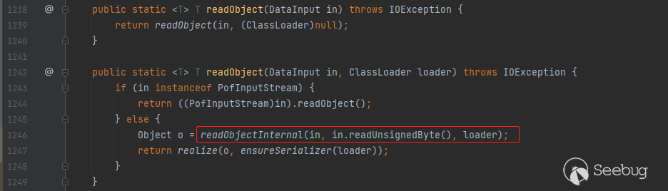 如果傳入的DataInput 不是 PofInputStream 的話(Coherence 組件歷史漏洞 涉及到的 ExternalizableHelper.readObject 傳入的 DataInput 都不是 PofInputStream),ExternalizableHelper#readObject 中會調用 ExternalizableHelper#readObjectInternal 方法: